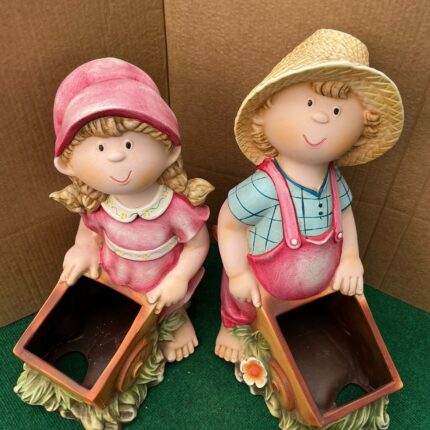 Casal de Agricultores Decorativo com Carrinho-Vaso